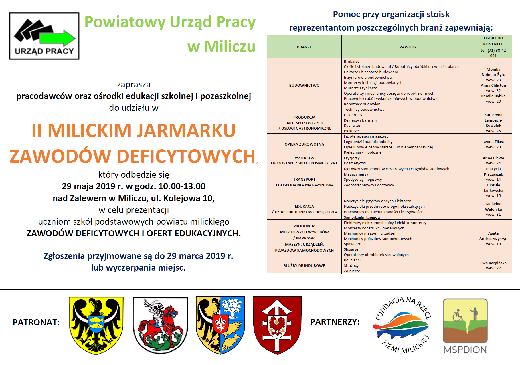 Powiatowy Urząd Pracy w Miliczu: Zaproszenie na II Milicki Jarmark Zawodów Deficytowych Data publikacji: wtorek, 05 marzec 2019 ‹ Powrót do listy aktualności